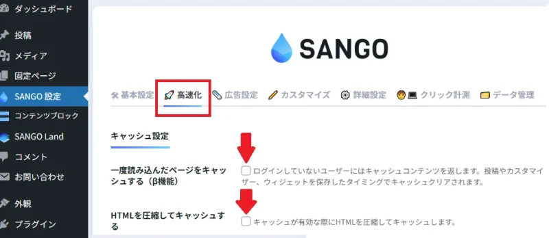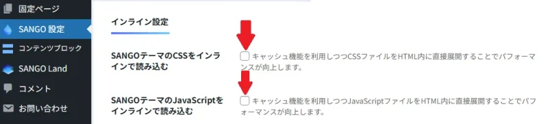 SANGO → 高速化設定→キャッシュ設定&インライン設定